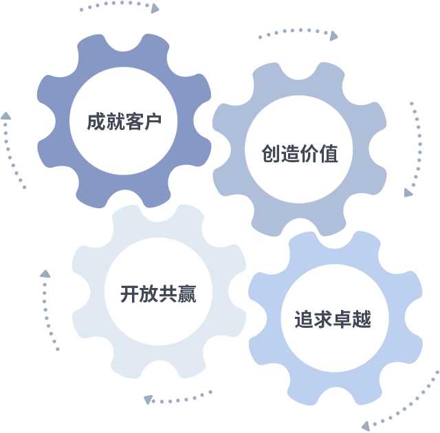 成就客户是一切决策的出发点,,创造价值是衡量所有工作的标准,,追求卓越是我们做事做人的态度,,开放共赢是我们的格局也是最终的结果。。价值观的齿轮环环相扣,,,,推动着组织里的每个人不断向前。。